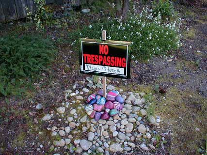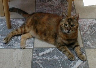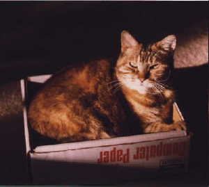 | Polly developed feline hyperthyroidism and passed away before her radiation treatment could begin. She died on November 5, 2000. We buried her in our back yard. Her grave later became the backdrop for the Magic Stones CD cover. I played bass on this CD for Bridget St John who is now known as Sweet Punch. |  Polly's grave decorated with painted rocks and a sign for the CD cover | Rest in peace, Polly |